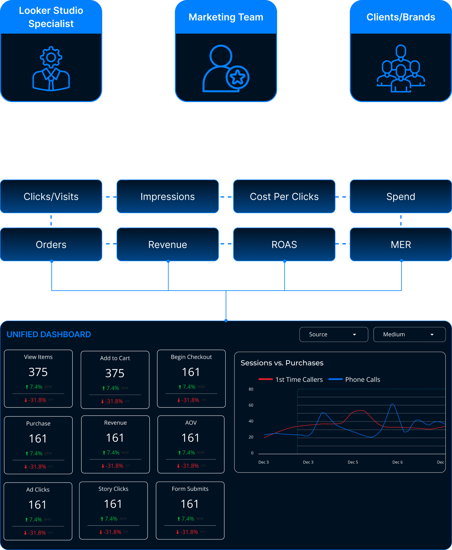 The goal was to design a unified dashboard that brings together data from GA4, Google Search Console, CallRail, and the client’s CRM into a single, cohesive view.