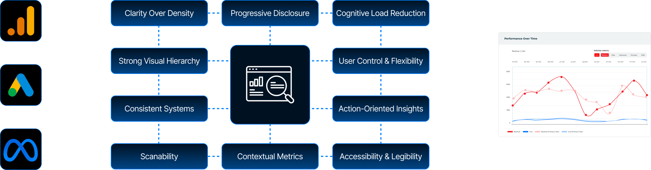 The process began by understanding user needs and key metrics, followed by a UX and data audit to uncover usability gaps. Insights were used to design a scalable dashboard structure and clear data visualizations, which were refined through ongoing validation and iteration.